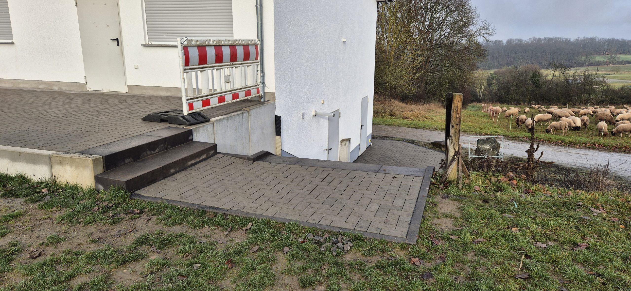 • Außenanlage: L-Stein-Umrandung für Terrasse gesetzt und Treppe auf der Seite Richtung Tennisplätze gesetzt.